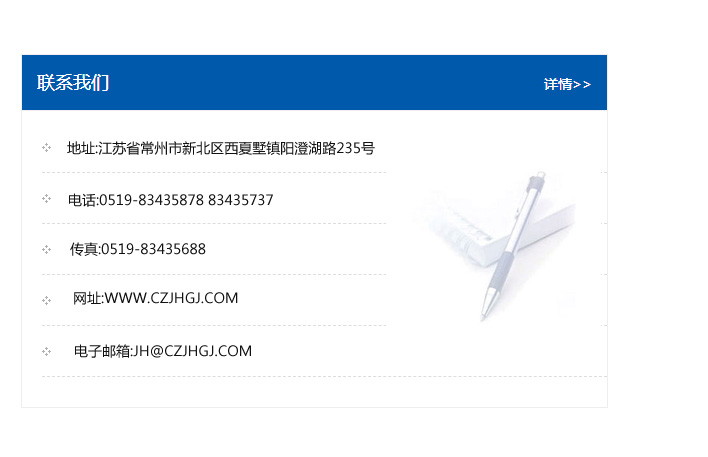 地址:常州市新北區友邦商務大廈1幢16、17層  電話:0519-85101652  傳真:0519-85112595  郵編:213022  網址:www_cz-jiayue_cn.sdwejx.com  郵箱:xiajifengaa@163.com